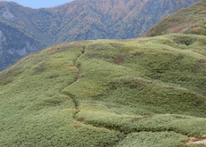 麦草岳から先は藪、ハイマツに覆われ所々ルート確認必要で、牙岩の前後のザレ、草付き帯はスリップ〜滑落に要注意でしたがそれ程の難度ではなく好天のもと雄大な眺望が得られる静かなルートでした。