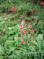 河原木場沢は水量が多めの小滝が連続して現われ、みんなしっかり合羽を着込んで果敢に直登。頭の上から水をかぶりながら、手掛りを探すという初めての体験もしました。また気持ちのいいナメを随所で楽しみながら、見頃のクリンソウが両岸に群生して見事なお花畑を作っていたのには、歓声があがりました。