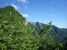 合戦沢の頭を越えると稜線の向こうの景色が見え始め、燕山荘まで登ると裏銀座縦走コースの山並みが槍ヶ岳まで一望のもとに広がっている。