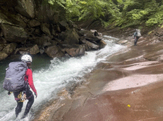 30〜40分ほどして4mほどの滝が現れます。リーダー谷内さんにロープを出してもらい、フリクションの効くところを探りながら足を置く。沢デビューの圷さんは登攀系の経験があるので危なげなくクリア。 つづきはこちらをご覧ください。(PDF)