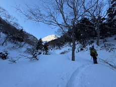 赤岳山荘までの運転は毎回緊張。雪も少なめ凍結無しで助かりました。気温は高めで身支度整えスタートです。ひたすら黙々と歩きます。私は久々の行者小屋。テント撤収の方々やこれからアタックするクライマーたち。日の出前は凍てつく寒さもあり私は一気に緊張してきた。目指す阿弥陀が日に照らされ眩しいくらい。装備を整えいざ取付きまで急ぎます。遠目で2パーティくらいかと思いましたが着いてみると4パーティくらいいてびっくり。巻いて行く方もいました。30分くらいは待ちましたがとにかく天気が快晴、無風でだいぶ助けられました。後続も到着。本当に北稜は大盛況!!いざ私たちの番になり、谷内さんリードで開始です。1ピッチ目の最初が怖かったです。グローブを厚めの物にしていたので、岩を掴んでいる感覚がなくて、次回は薄めにしようと。スムーズに2ピッチ目も終え、今シーズン2回目の快晴阿弥陀岳登頂出来ました。山頂は本当に穏やかで無風なくらい。下山は中岳沢。私はこの山頂直下が1番怖かったです!!!良い経験が出来ました。取付き渋滞に会いましたが、全体的にスムーズに行けて駐車場に着くのも早かったです。